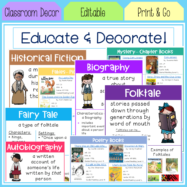 First, decorate your library with these cute and informative genre posters! Each poster displays a description and book covers representing the featured genre. These reading genre posters come with a detailed book list for each genre! The lists include a link for each book if you want to purchase it as well as AR, DRA, Lexile, and Guided Reading levels for almost all of the books! I also included genre bookmarks that your scholars can color in. I like to leave these in my classroom library for student to grab if they need a bookmark.